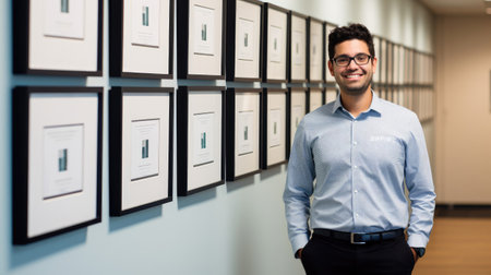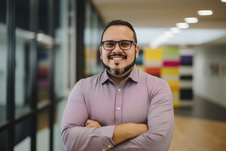 Young smart hispanic businessman, smiling face, standing in blur background of creative colorful office interior design. Generative AI AIG20.