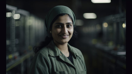 A smiling Indian female factory worker standing in metal sheet factory. Generative AI AIG19.
