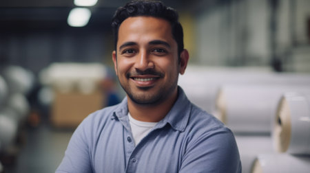 A smiling Hispanic male factory worker standing in warehouse. Generative AI AIG19.