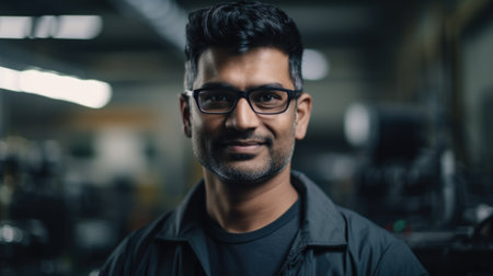 A smiling Indian male electronic factory worker standing in factory. Generative AI AIG19.