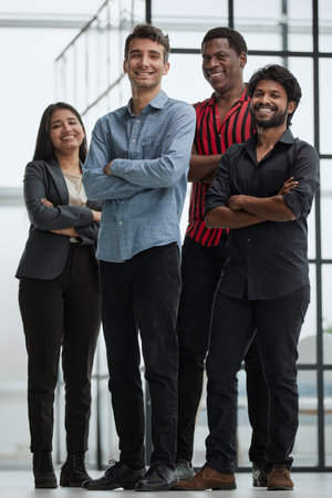 Portrait of confident business team standing in office. Multiethnic business people.