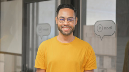 A young man wearing glasses smiles warmly at the camera in a vibrant office setting. Natural light fills the room enhancing the positive atmosphere as colleagues work nearby.