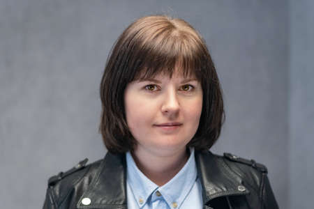 Portrait of young woman with bob haircut in leather jacket. Brunette girl with round face shape