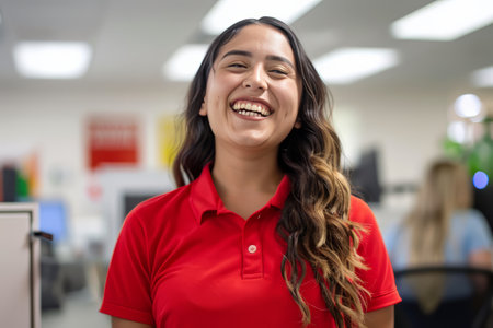 A young Mexican community manager wearing a red polo shirt in a well illuminated white office, laugh. High quality photo