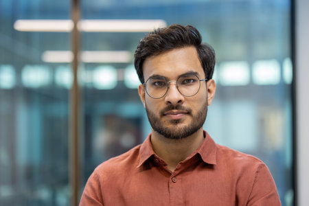 Confident young businessman wearing glasses stands in modern office. His composed expression reflects professionalism and focus. Ideal for business, corporate showcasing leadership and career success