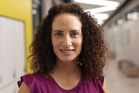 Close-up portrait of smiling caucasian young female teacher with curly hair standing in school. unaltered, education, occupation and school concept.