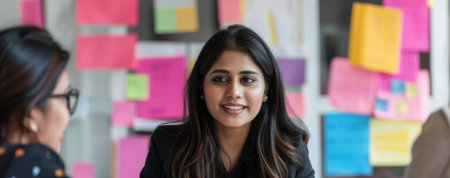 an Indian businesswoman planning a marketing strategy with colleagues in a bright office