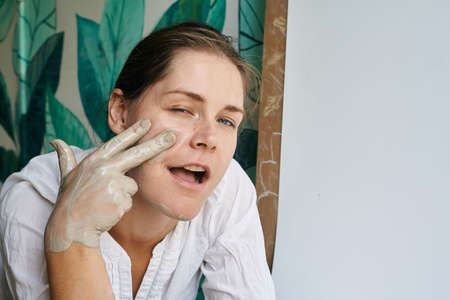 Young woman applying mask of clay on face in beauty spa.