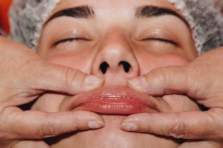 Young female face close-up, top view. The hands of the massage therapist makes a rejuvenating massage on the face. The concept of medicine and cosmetology.
