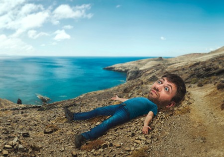 point of view. man sitting on the cliff. legs in blue jeans and white shoes. copy space