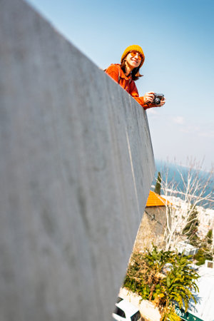 Happy Girl with a camera. Young tourist sightseeing and walking around the city. Girl taking pictures of sights. Girl traveling and taking pictures. Tourist walking around the city.