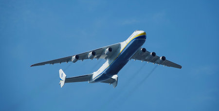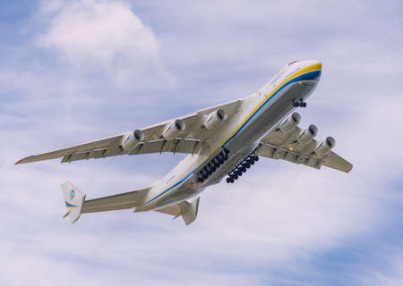 AN-225 Antonov Mriya departed from the Kyiv-Antonov-2 International Airport to perform commercial cargo shipping flight. AN-225 is the world's largest transport aircraft. June 2021