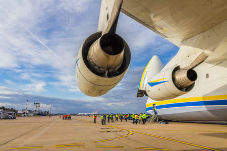 ZAGREB, CROATIA - NOVEMBER 10: Loading heavy weight cargo to the Antonov 225 Mriya airplane on November 10, 2013 Zagreb, Croatia. It is the biggest airplane in the world.