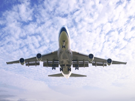 Large four engine jet transport aircraft flying high in the clear blue sky with white clouds