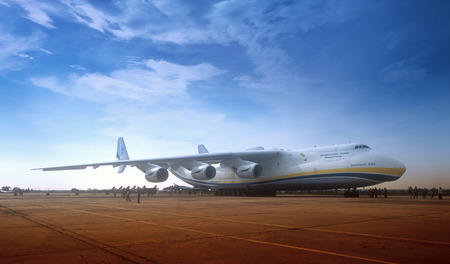 Kiev Region, Ukraine - January 8, 2012: Antonov An-225 cargo plane is landing on sunset