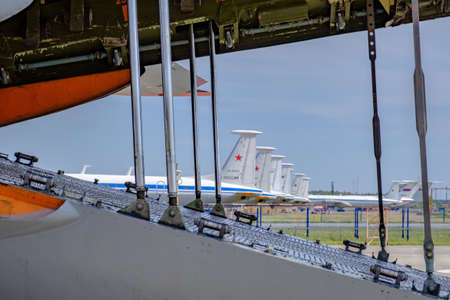 Moscow regional. Airport Chkalovsky, 12 August, 2018: Airplane before loading cargo with open compartment. Other aircraft of air forces on background.
