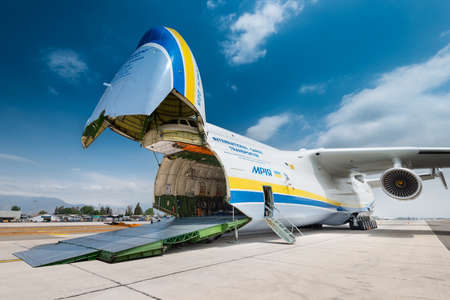 Santiago de Chile, Metropolitan Region, Chile, South America - The Antonov 225 also know as AN-225 and the biggest airplane in the world, with nose up and ramp deployed ready for cargo to go inside.