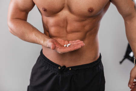 Muscular athletic guy with a naked torso is holding vitamins and steroids pills. Sports and supplements. Healthy lifestyle and medicine