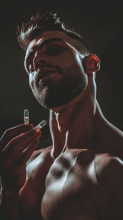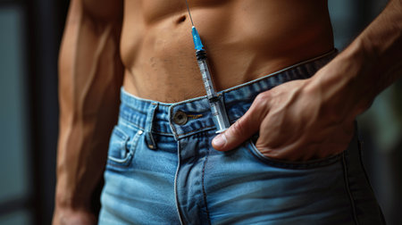 Unveiling the Dark Side: Intense Close-up of Muscular Man Administering Steroids at the Gym --ar 3:2