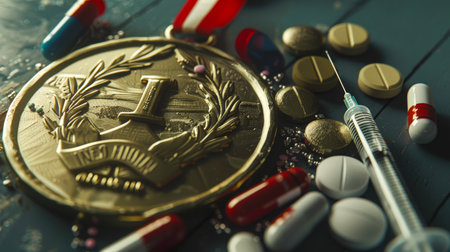 A gold medal with the number 1 in a laurel wreath on it is surrounded by pills and a syringe with steroids. The doping scandal at the Olympics. A sports concept. Medicine and health Medicine and health
