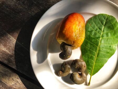 The cashew fruits, nut and leaf in white dish on wooden floor