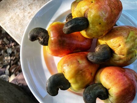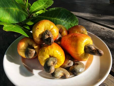 Close-up the ripe cashew fruits in white dish on the table