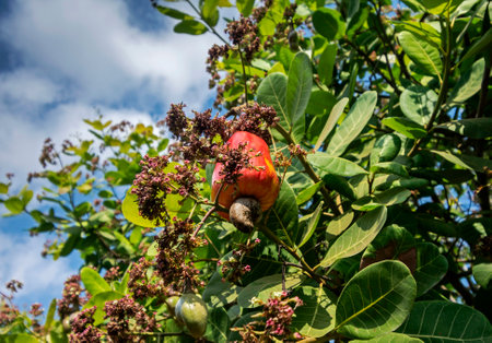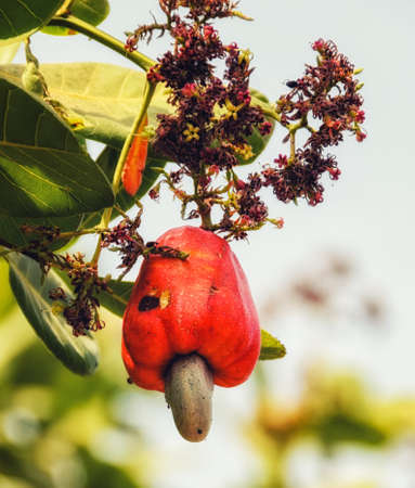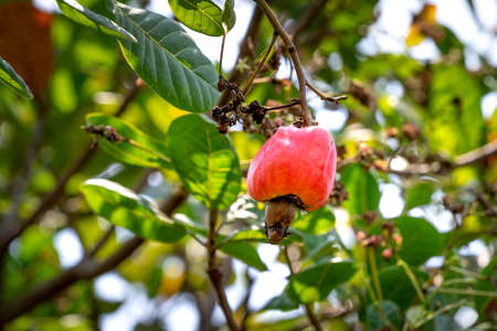 Cashew fruit ripe red (Anacardium occidentale) hanging on tree