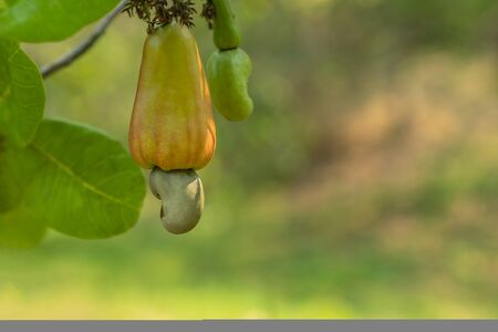 A bunch of cashew apples hanging on its tree, natural blurred background.