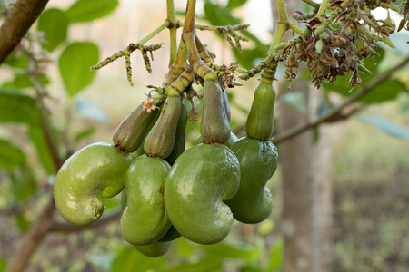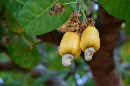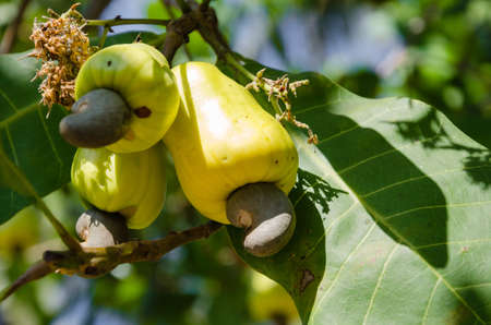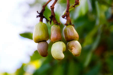Ripe cashew nuts Anacardium occidentale grow on a tree branch in the garden