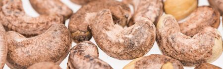 close up view of cashew nuts isolated on white, panoramic shot