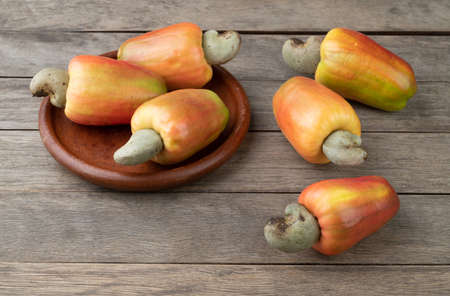A group of cashew fruits on a plate over wooden table.