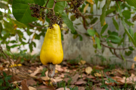 Fresh yellow cashew fruit growing on a tree in the garden. Cashew is an American native fruit.