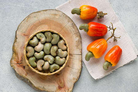 Cashew apple and cashew seeds arranged on a grey textured background ,where a basket full of cashew seed are placed on wooden piece, top view.