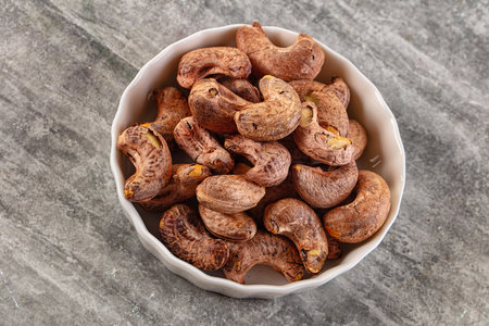 Unpeeled cashew nuts heap in the bowl