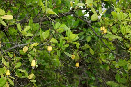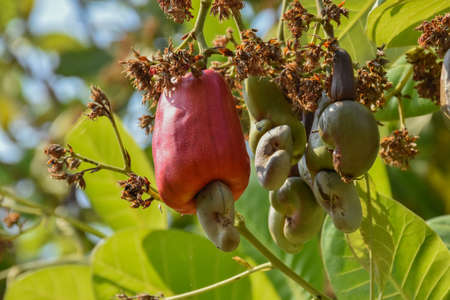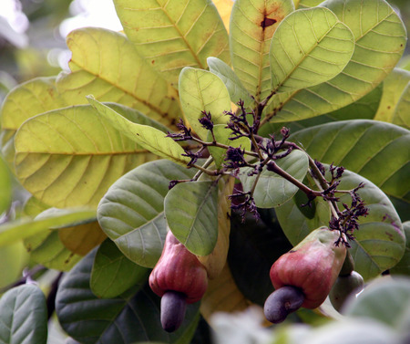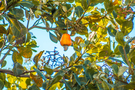 Ripe cashew nuts on a cashew tree in the sunshine