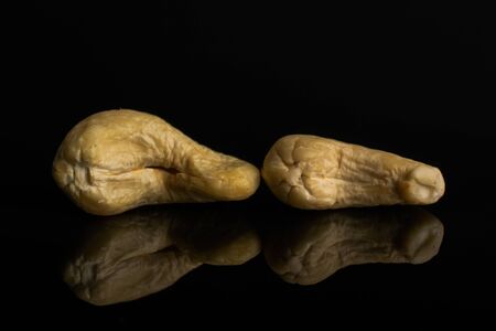 Group of two whole unsalted beige cashew isolated on black glass