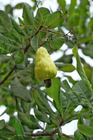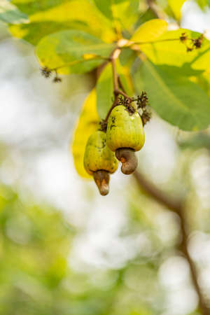Cashew fruit (Anacardium occidentale) hanging on tree. Extraordinary nut grows outside the fruit.