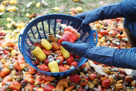 Hand harvesting Cashew fruit cashew apple in hand