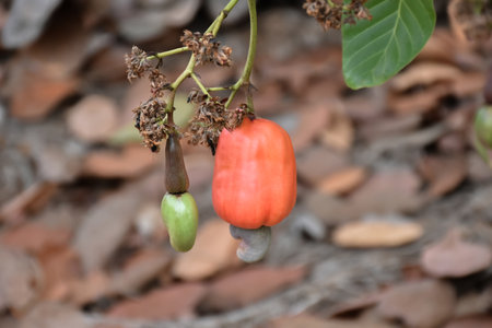 Red ripe cashew apple fruits hanging on branches ready to be harvested by farmers. Soft and selective focus.