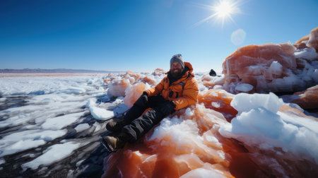 A cheerful man sits on icy orange formations at Lake Baikal, surrounded by a stunning winter landscape under a bright sun.