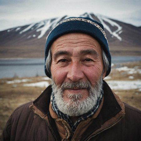 A distinguished Chukchi elder stands proudly against the breathtaking mountains of Chukotka, embodying the rich cultural heritage and strength of his community amidst nature grandeur.