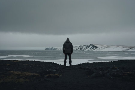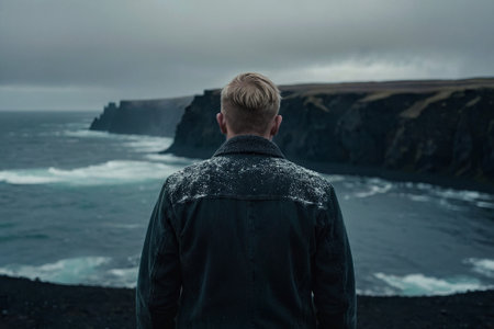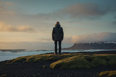 A young man in a black jacket standing in front of the ocean on a cloudy day. Iceland