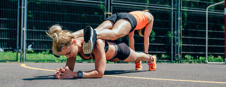 Wellness and Friendship. Friends engaged in a plank exercise at the gym.