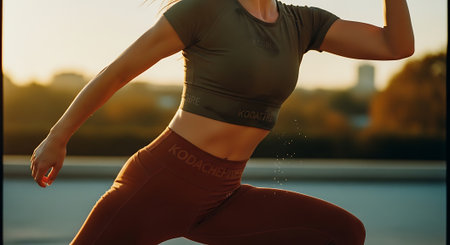 A woman in a green sports bra and brown leggings performing a lunge exercise outdoors at sunset.