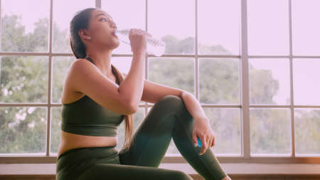 Asian girl drinking water after exercising at home.