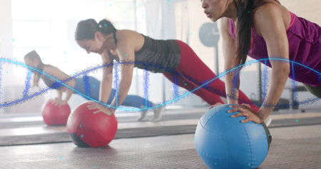 Image of dna strands over caucasian women exercising at gym. Technology, sport and digital interface concept digitally generated image.