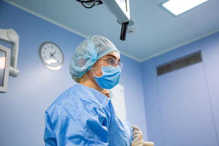 Female Doctor in Surgery Operating Hospital Room. Surgeon medic in protective work wear gloves, mask and cap