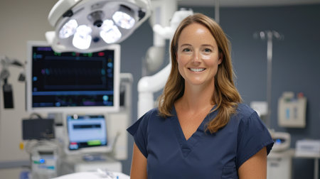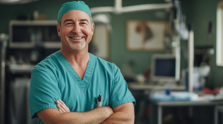 Portrait of cheerful surgeon in blue scrubs and surgical cap standing in operating room with medical equipment and operating lights in background