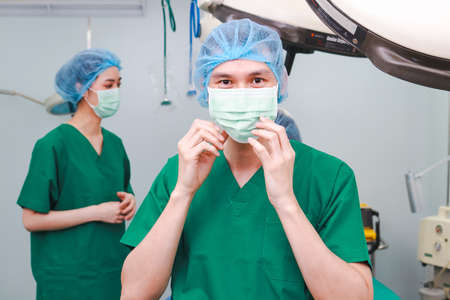 Close up man doctor professional surgeon physician in medical uniform binocular. Team of medics prepare for operation in surgery room on background copy space hospital medical and health care services