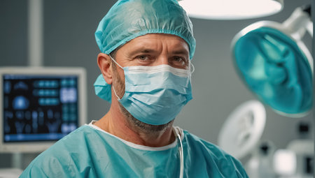 A portrait of a focused surgeon in an operating room, illuminated by bright surgical lights. The intense gaze and high-tech environment highlight the seriousness and precision of medical procedures.. AI Generation